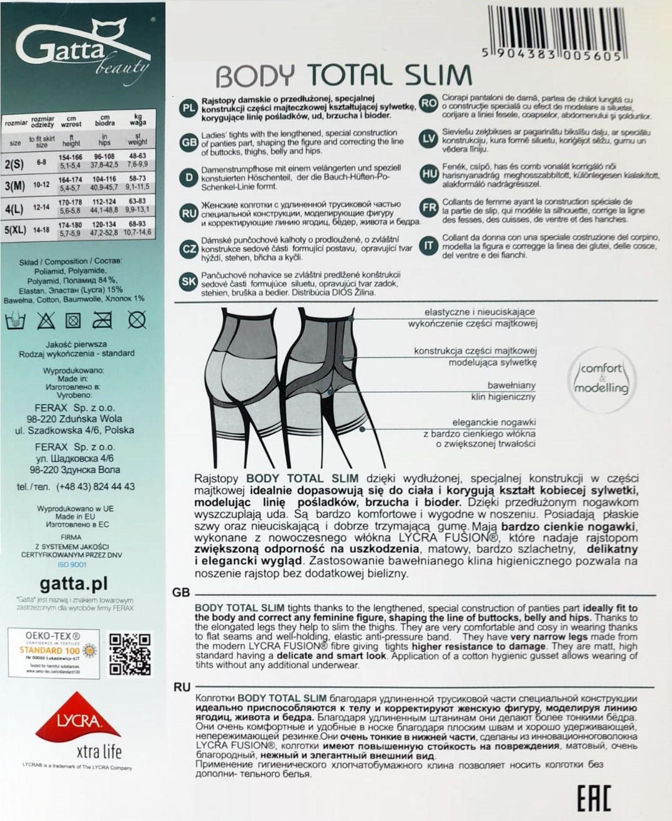 Women’s tights that shape the figure. Made of modern Lycra Fusion fiber with increased durability and resistance to damage. Thanks to the special construction in the panty part, they fit the body exactly and shape the line of the buttocks, thighs, stomach and hips. Finished with a comfortable, non-compressive elastic band at the waist, which does not restrict movement and is invisible under clothing. The use of a cotton hygienic gusset allows you to wear tights without additional underwear. Sewn with a flat comfortable seam. Thickness: 10 DEN. Composition: 84% polyamide, 15% elastane, 1% cotton.