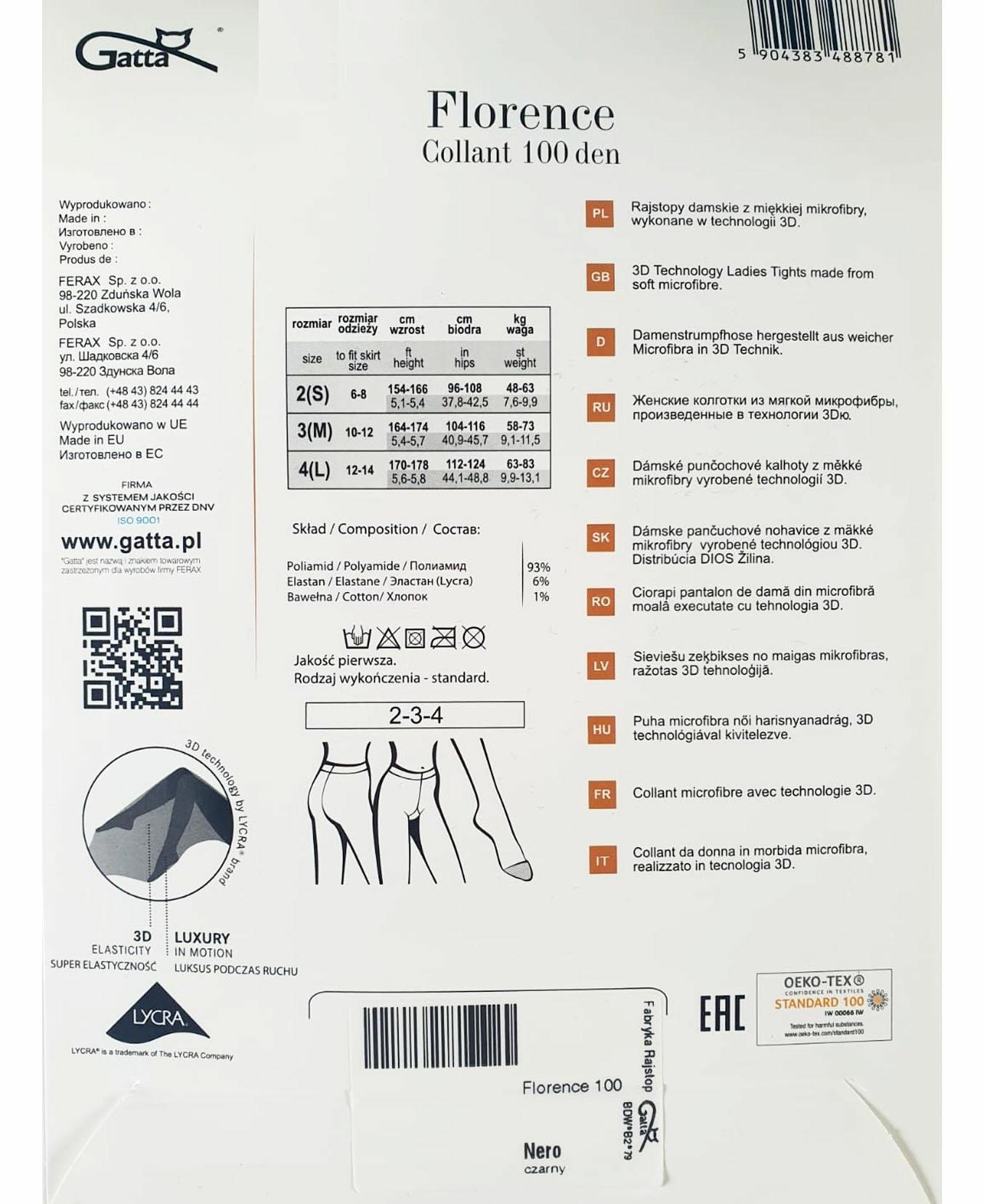 Elegant, smooth women’s tights with a subtle satin sheen. Opaque, made of the highest quality 3D Lycra yarn, they are stretchy, fit perfectly, and look great. The waistband is finished with a wide, comfortable elastic band that prevents pressure and keeps the tights in place. The tights have a non-marked panty section and a small gusset. They feature reinforced toes for added durability. Thickness: 100 DEN. Composition: 93% polyamide, 6% elastane, 1% cotton.