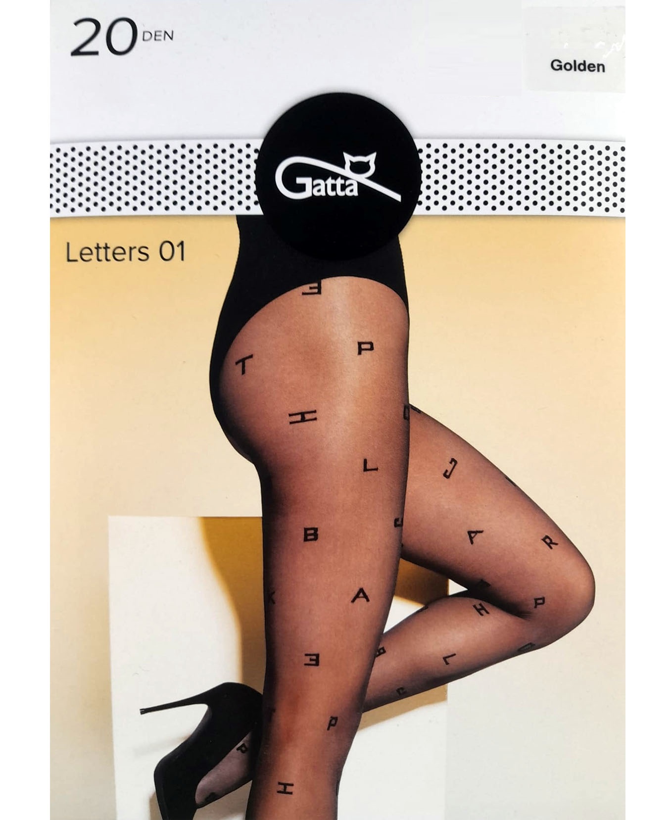 Elegant women’s tights decorated with a scattered letter pattern. Transparent, matte, and made of the highest quality yarn. The tights have no marked panty line. The lack of reinforcement in the toe makes them suitable for open shoes. Thickness: 20 denier. Composition: 88% polyamide, 12% elastane.