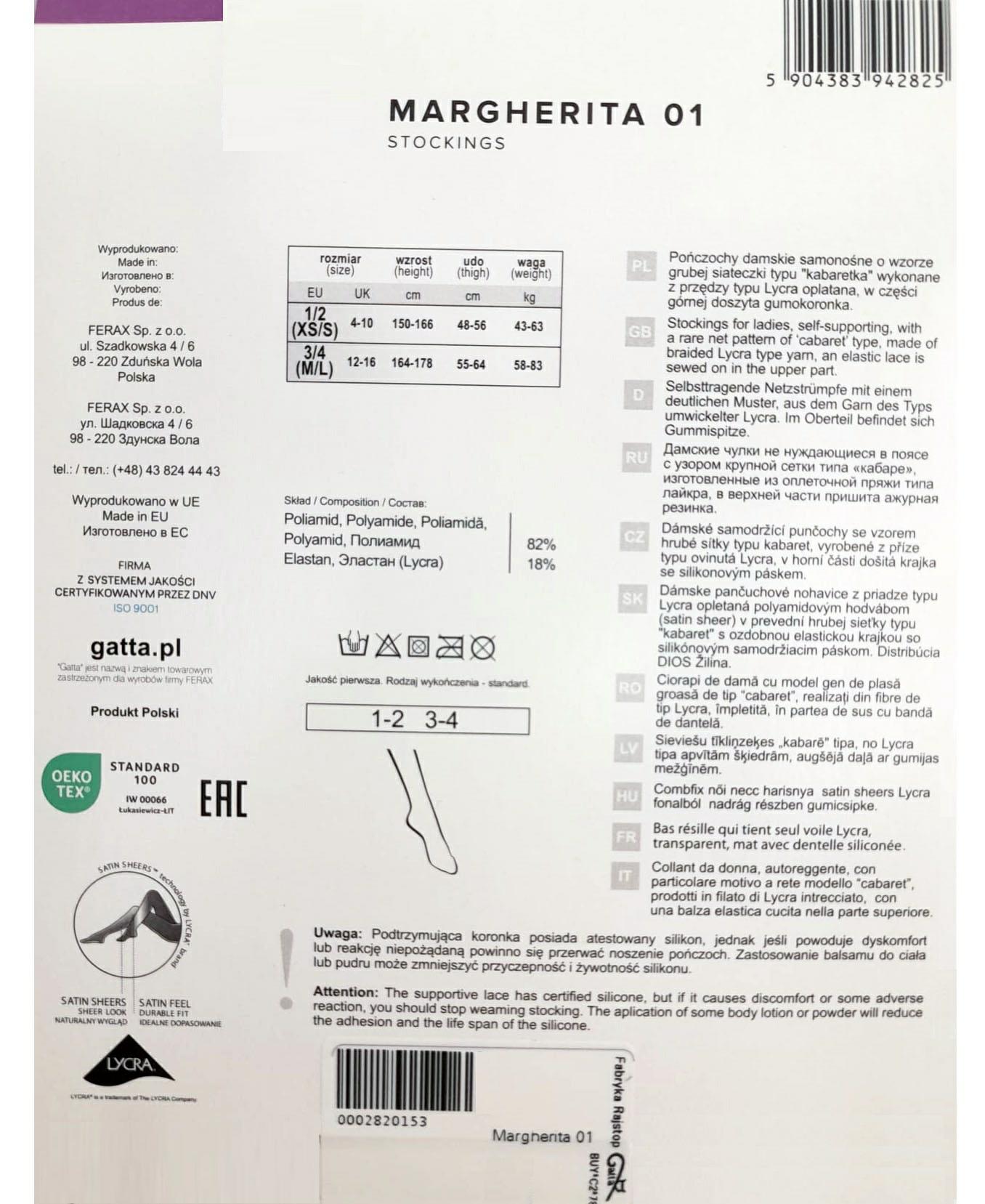 Classic and very feminine self-supporting, fishnet stockings. Made of polyamide with the addition of LYCRA fiber. Very elastic, they fit perfectly to the body. In the upper part finished with sewn-in, silicone elastic lace with a subtle floral pattern, this ensures that the stockings stay in place and emphasizes their sensual character. The lack of a marked toe part means that they also fit open shoes. Perfect for spring and summer. Composition: 82% polyamide, 18% elastane.